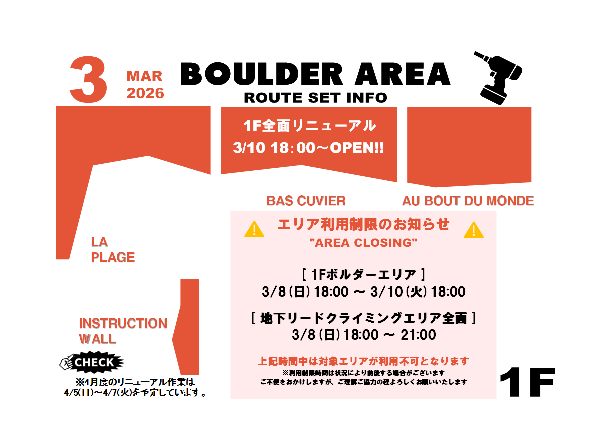 いつもご利用いただきありがとうございます。 1階ボルダーエリアリニューアルにあたり、事前準備作業とセットのため3/8(日)18時より3/10(火)18時まで1階ボルダーエリア全体がご利用いただけませんのでお気をつけてご来店ください。また、3/8(日)18:00から当日閉店まではホールド洗い作業のため地下リードエリアもご利用ができなくなりますのでご注意ください。ご不便をおかけいたしますが、ご理解ご協力の程お願いいたします。 リニューアル後の新しい課題をお楽しみに!!We close the whole of 1F bouldering area on 3/8(Sun)18:00 ~ 3/10(Tue) 18:00 due to renewal settings. Also, we close B1 route climbing area on 3/8(Sun) 18:00 ~ 21:00.