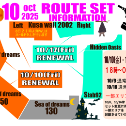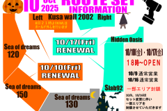 *10/8(水)21:00~Kusa Wall Right のホールド外し 10/9 (木)14:00 OPEN~強傾斜エリア封鎖 10/10(金) 18:00 OPEN~ * 10/16(木)14:00 OPEN~緩傾斜エリア封鎖 10/17(金) 18:00~ OPEN