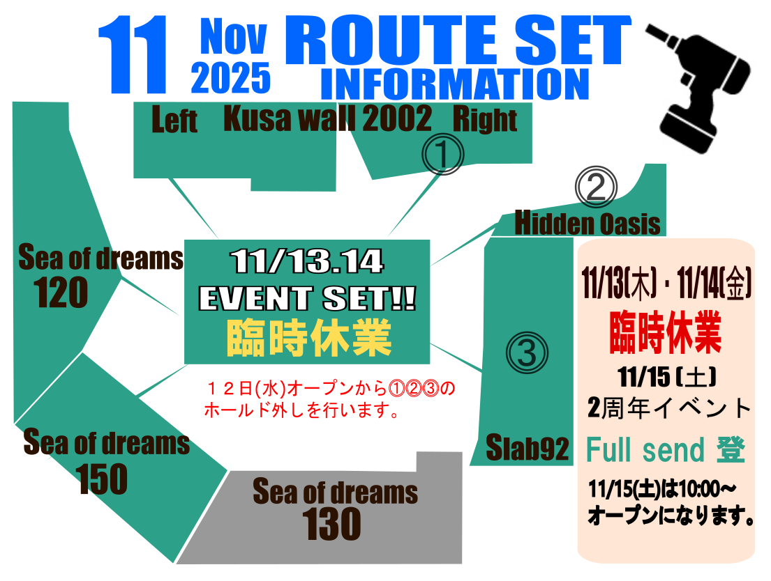 11/12(水)オープンからKusa Wall Right&Hidden oasis&Slab92のホールド外しを行います。(通常営業) 11/13(木)セットのため臨時休業 11/14(金)セットのため臨時休業 11/15(土)2周年イベント!! 10:00 OPEN