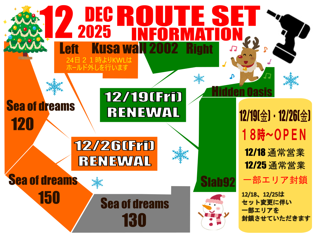 *12/17(水)21:00~Kusa Wall Right のホールド外し 12/18 (木)14:00 OPEN~緩傾斜エリア封鎖 12/19(金) 18:00 OPEN~ *12/24(水)21:00~Kusa Wall Left のホールド外し 12/25(木)14:00 OPEN~緩傾斜エリア封鎖 12/26(金) 18:00~ OPEN