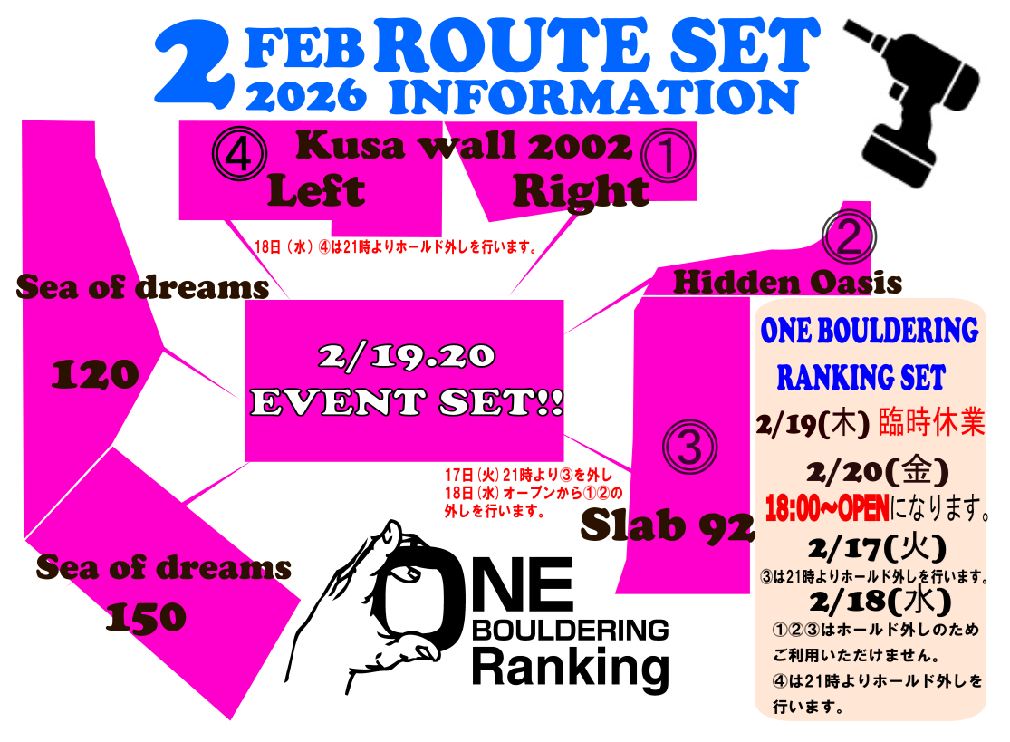 ✨2月はONE BOULDERING RANKING SET✨ 東村山店がラストになります❗️❗️❗️ 2/17(火)21時よりSlab 92のホールド外し(通常営業) 2/18(水)はオープンからホールド外しのため⓵⓶⓷の壁はご利用いただけません。⓸は21時よりホールド外しを行います。(通常営業) 2/19(木) SET ⚠️臨時休業⚠️ 2/20(金) SET 18時~OPEN ワンボルランキングスタートになります🤩 みんなの熱いトライ待ってます🔥🔥
