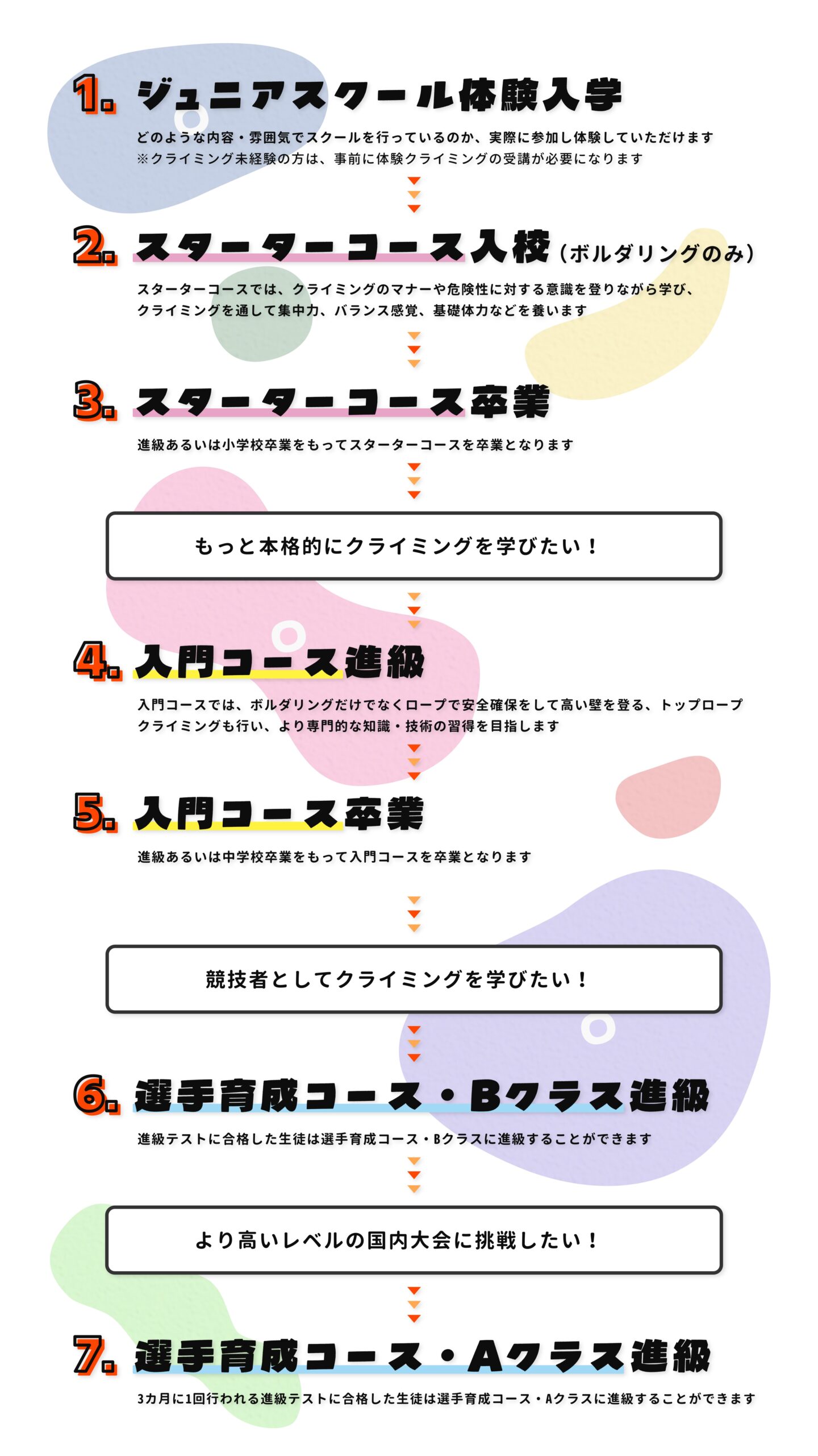 | 対象 | ・小学 1 年生 – 小学 6 年生まで ・クライミング初心者、経験の少ない方 ※クライミング未経験者の場合は体験クライミングを受講ください |