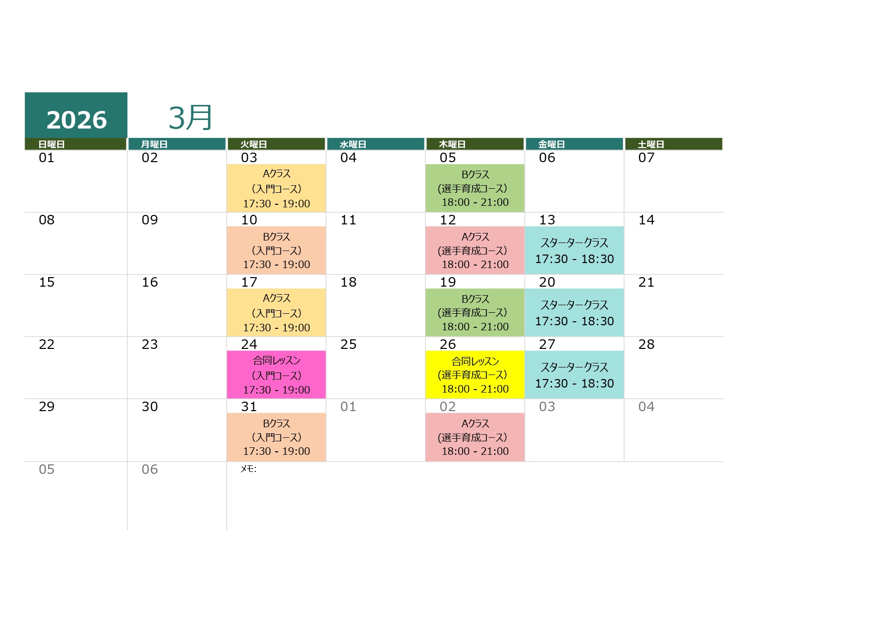 上半期 18 回 下半期 18 回 〈 年間 36 回 〉 詳しい日程はレッスンカレンダーをお渡ししています |