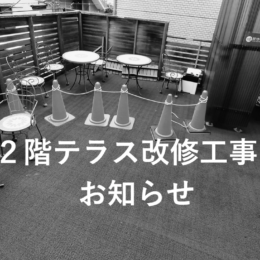 3月2日(月)~約1カ月の間、2階テラスの改修工事を実施いたします。ご不便をおかけいたしますがご理解とご協力をお願いいたします(工事期間中は店内に喫煙スペースはございませんのでご注意願います)