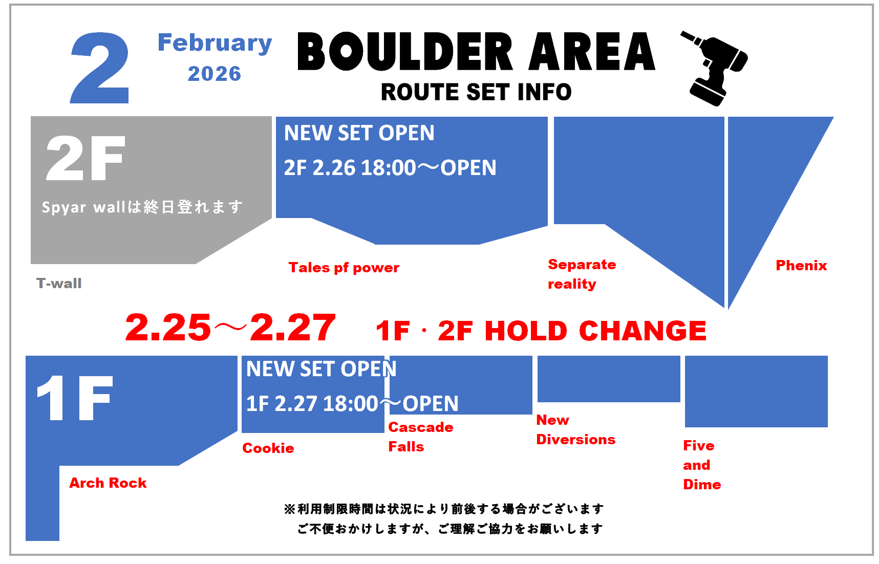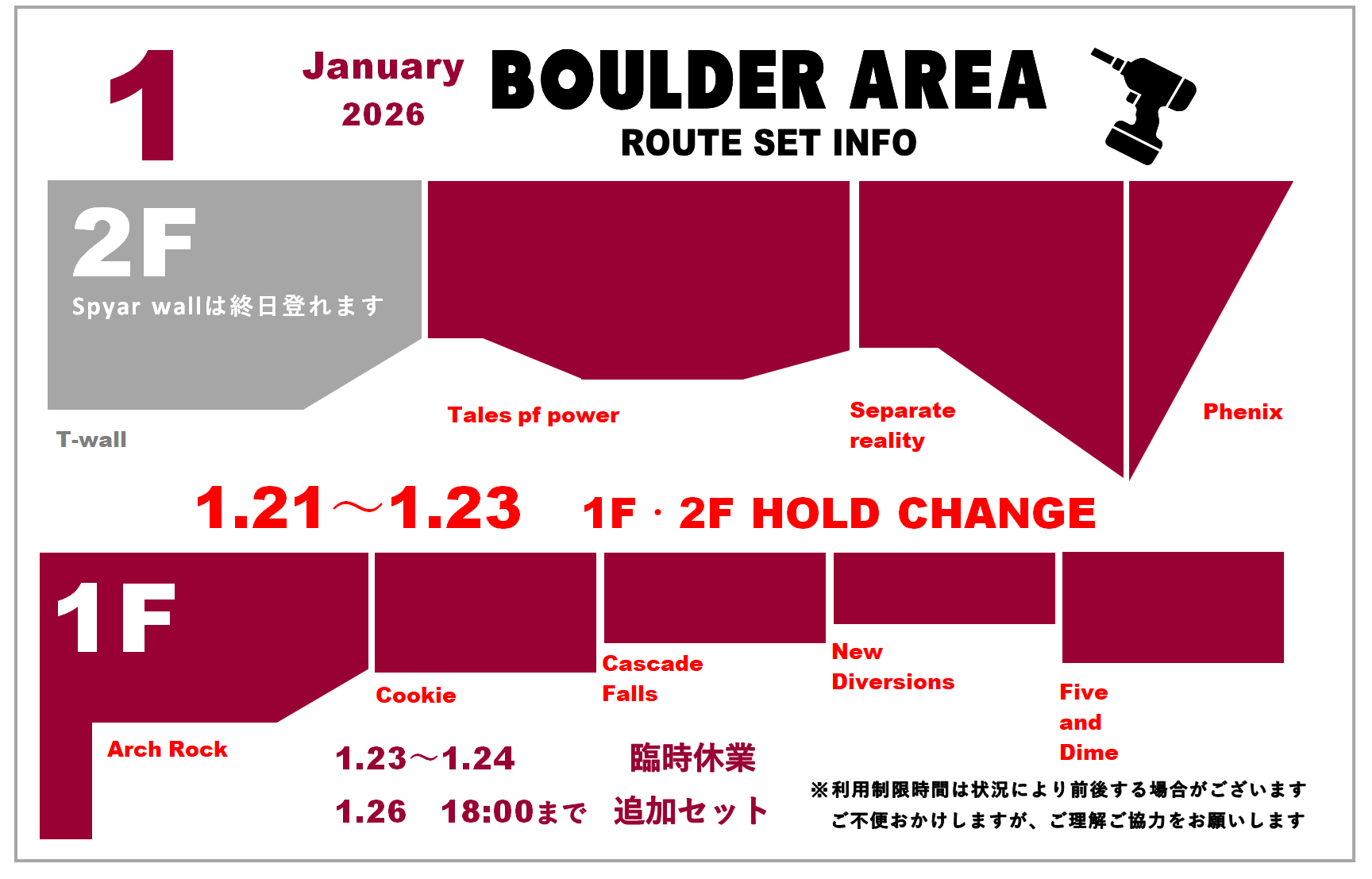 ホールド替えのため一部エリアを閉鎖させていただきます。ご来店の際はお気を付けください。
