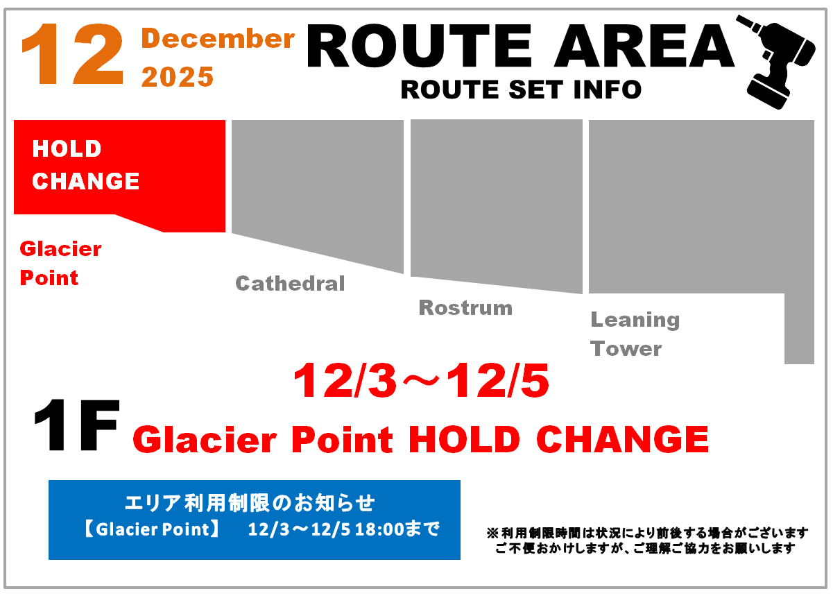 2025年11月27日 リニューアル リードエリア”Glaicer Point”リニューアル 12月3日(水)~5日(金) 12月3日(水)ホールド外し、12月4日(木)、5日(金)リニューアルセット。5日(金)18:00~登れます。ご来店お待ちしております。
