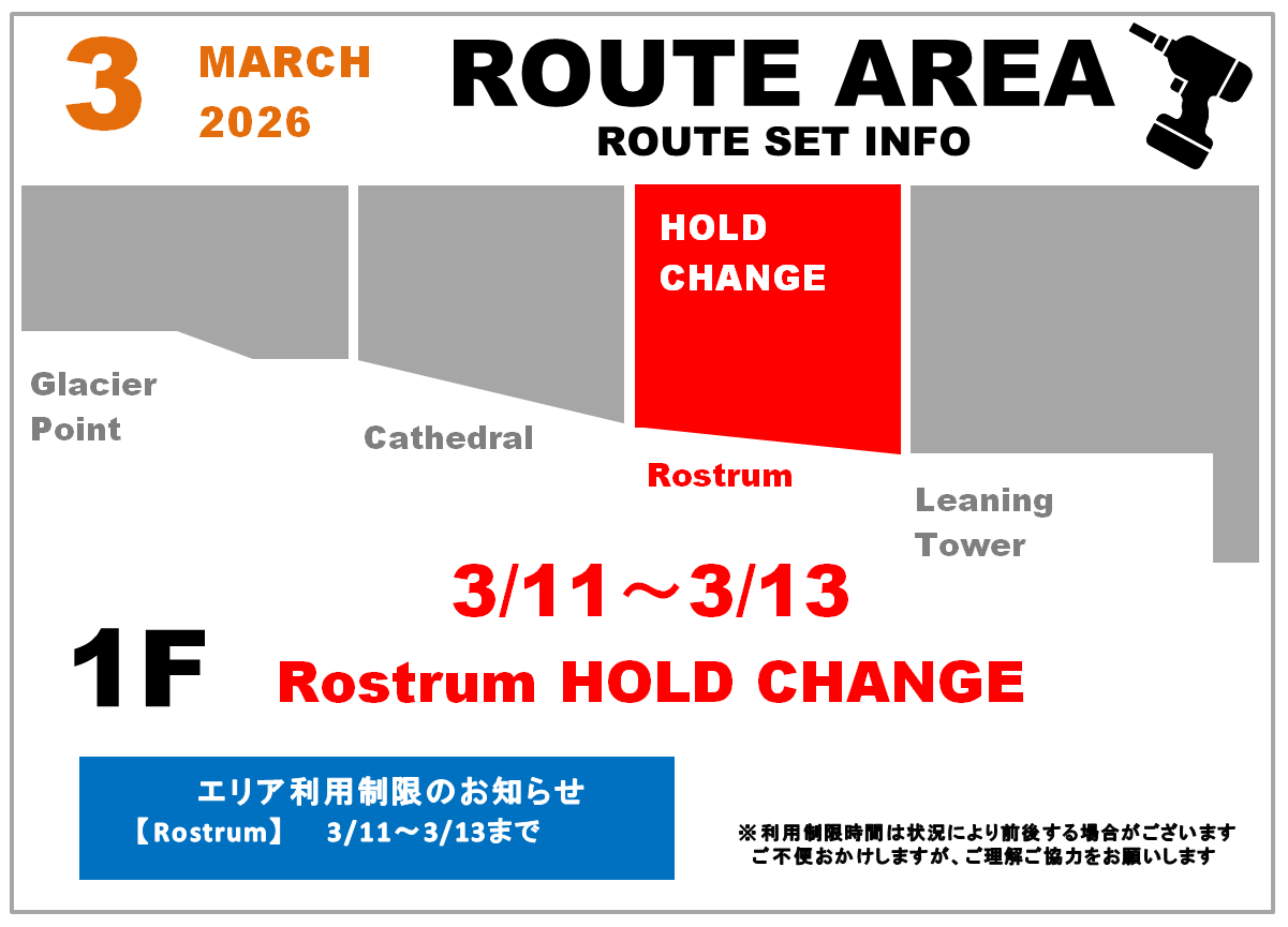 リードエリア”Rostrum”リニューアルセット。現在のルートがトライできるのは3月10日(火)まで。 回収お待ちしています!