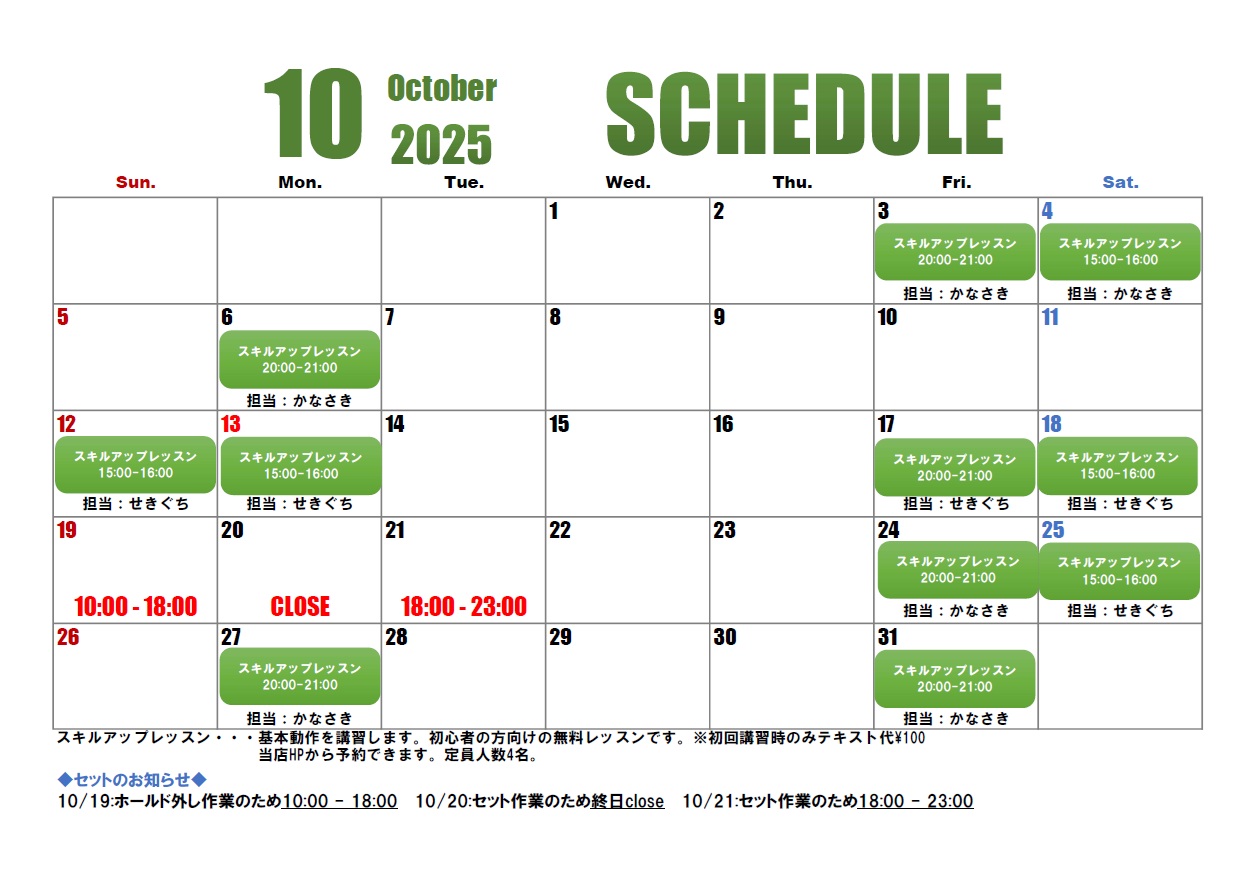 2025年09月29日 2025年 10月スクールカレンダー 10月のスキルアップレッスン日程をUPしました!! 10月も少しだけ開催の曜日が変則的になっておりますが、 たくさんのご参加お待ちしております。