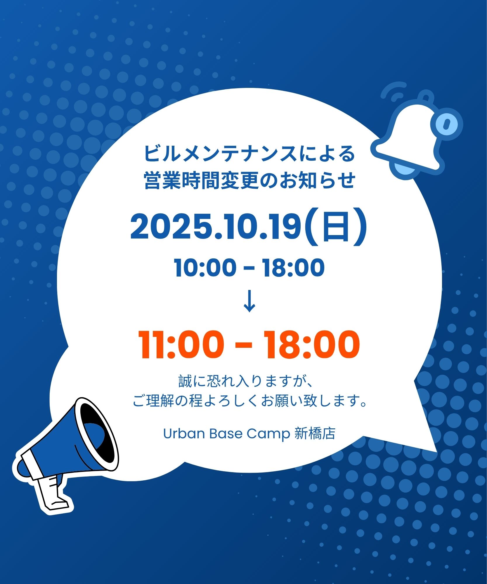 2025年10月07日 10/19(日)営業時間変更のお知らせ 10/19(日)はビルメンテナンスとホールド外し作業の為、 営業開始時間を11:00~18:00とさせて頂きます。 ご来店の際はご注意下さい。 ご理解ご協力の程よろしくお願い致します。