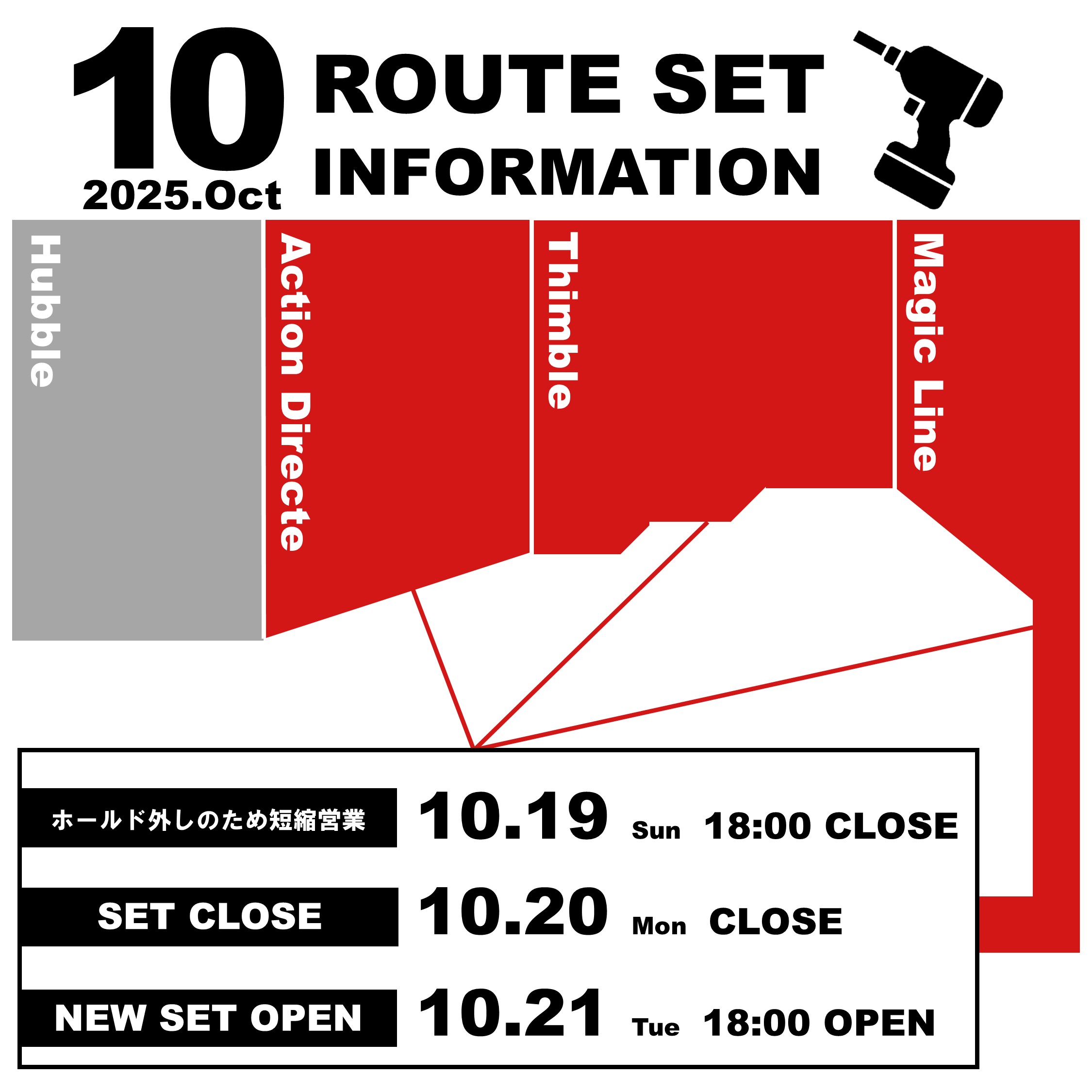 新橋店、10月セットインフォメーション‼ stride4課題は楽しんで頂けましたでしょうか!? 今セットも個性豊かな課題が多かったかと思います!☆ 10月ゲストは世界選手権でも活躍したあのお方!! ####### 10/19(日) ⚠️11:00~18:00close⚠️ ホールド外し作業のため 10/20(月) ⚠️臨時休業日⚠️ 10/21(火) ラインセットリニューアル🤩 OPEN 18:00 〜 CLOSED 23:00 ####### ※10/19(日)はビル点検の為、営業時間が11:00~となります。 営業時間が異なりますのでご注意ください🙇♂️